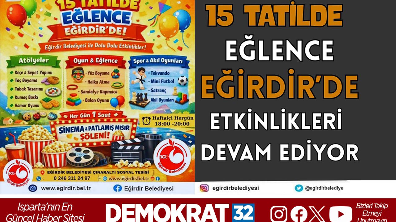 Eğirdir Belediyesi tarafından yarıyıl tatiline giren çocuklar için düzenlenen “15 Tatilde Eğlence Eğirdir’de” etkinlikleri, 27 Ocak itibariyle coşku ve neşeyle devam ediyor.