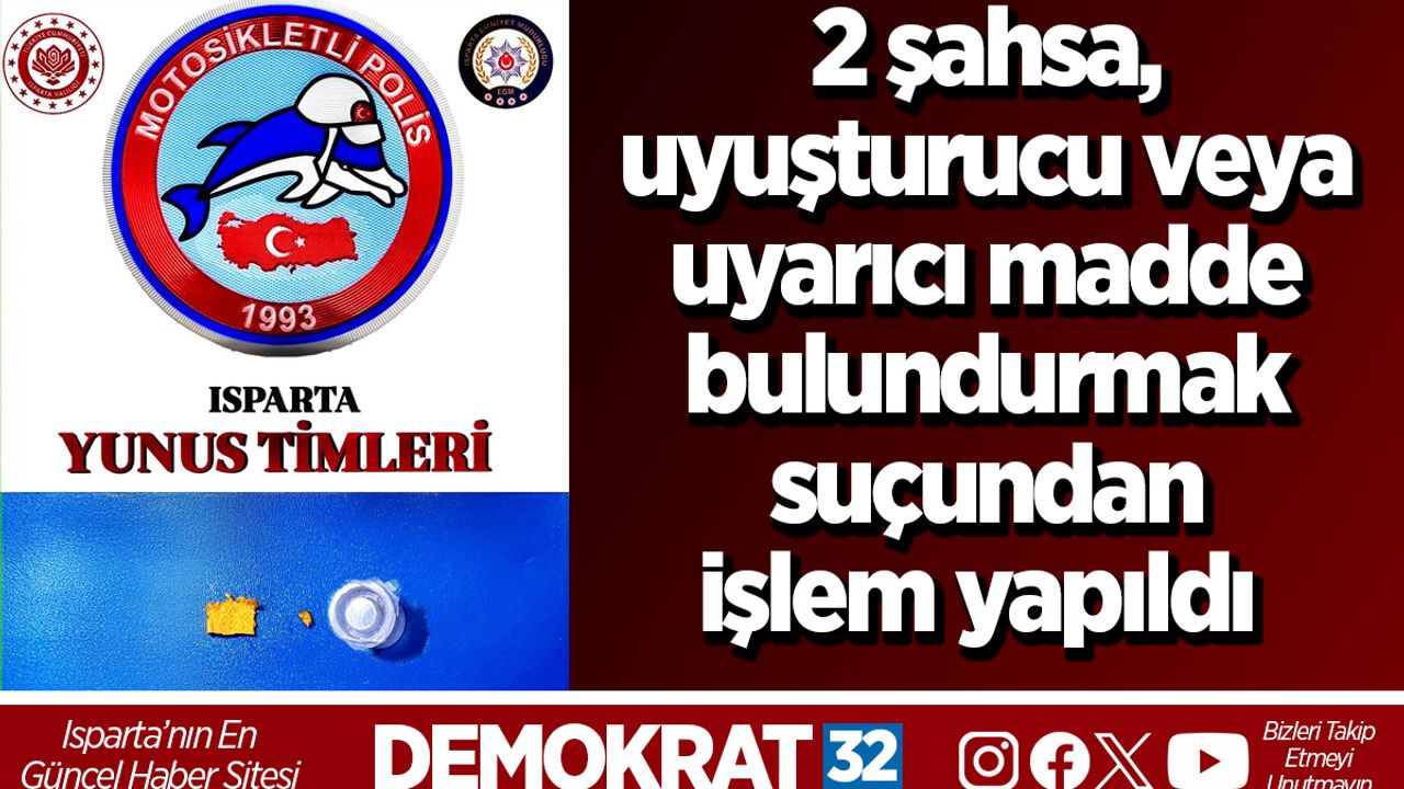 Isparta’da polis ekipleri tarafından yapılan denetimlerde 2 ayrı şahsa Uyuşturucu veya Uyarıcı Madde Bulundurmak suçlarından adli işlem yapıldı.
