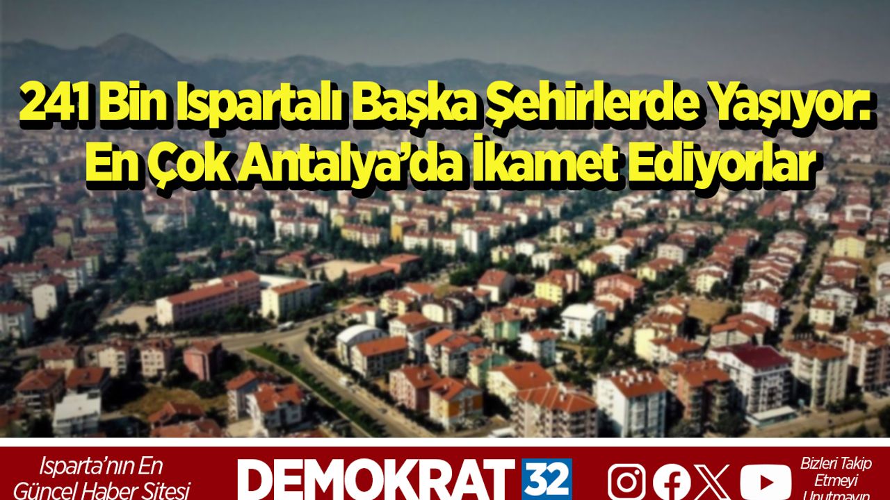 TÜİK ayrıca, Isparta nüfus kütüğüne kayıtlı olup başka illerde ikamet eden vatandaşların dağılımını da paylaştı. Buna göre Türkiye genelinde yaşayan toplam Ispartalı sayısı 564 bin 561 olarak açıklandı. Bu sayının 323 bin 251’i Isparta’da ikamet ederken, 241 bin 310 Ispartalı ise yaşamını başka şehirlerde sürdürüyor.