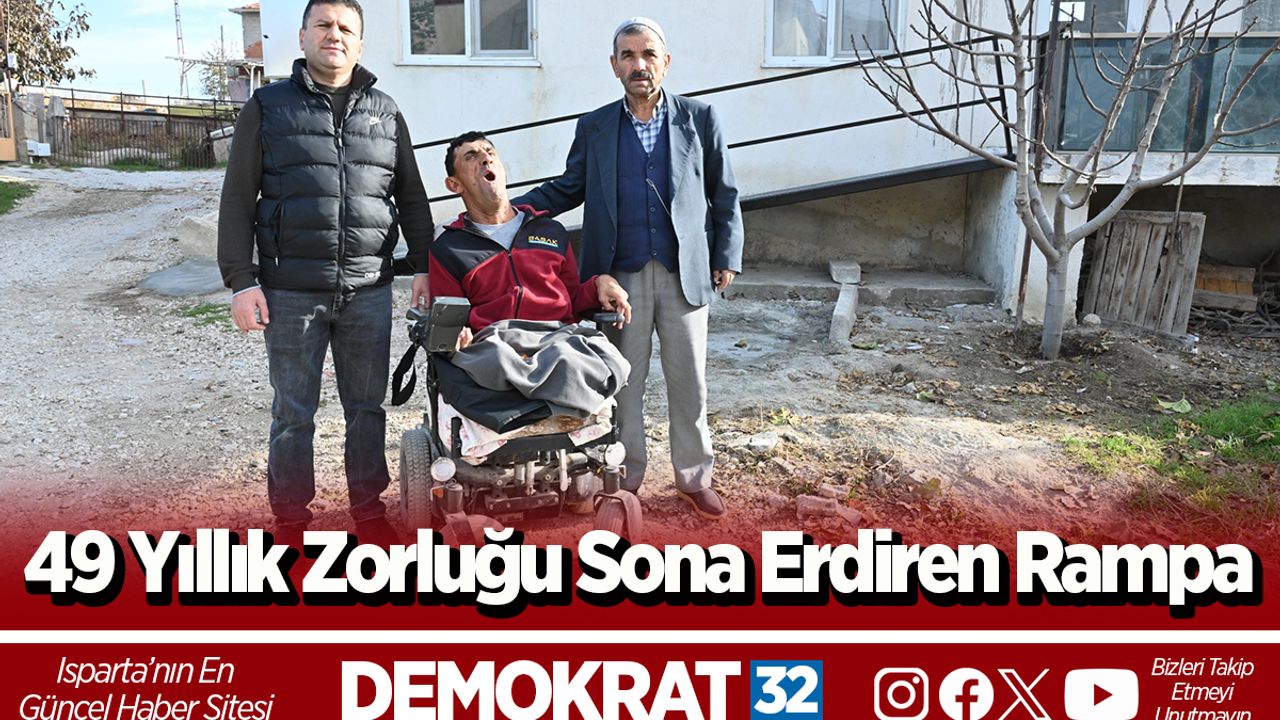 Isparta Belediyesi merkeze bağlı Bozanönü köyünde ailesiyle birlikte yaşayan ve eve giriş çıkışlarında aile bireylerinin sırtında taşınan 49 yaşındaki Arif Yıldırım’ın hayatını kolaylaştırmak için engelli rampası yaptı. Yıldırım artık engelli rampası sayesinde evine istediği zaman rahatça girip çıkabiliyor.