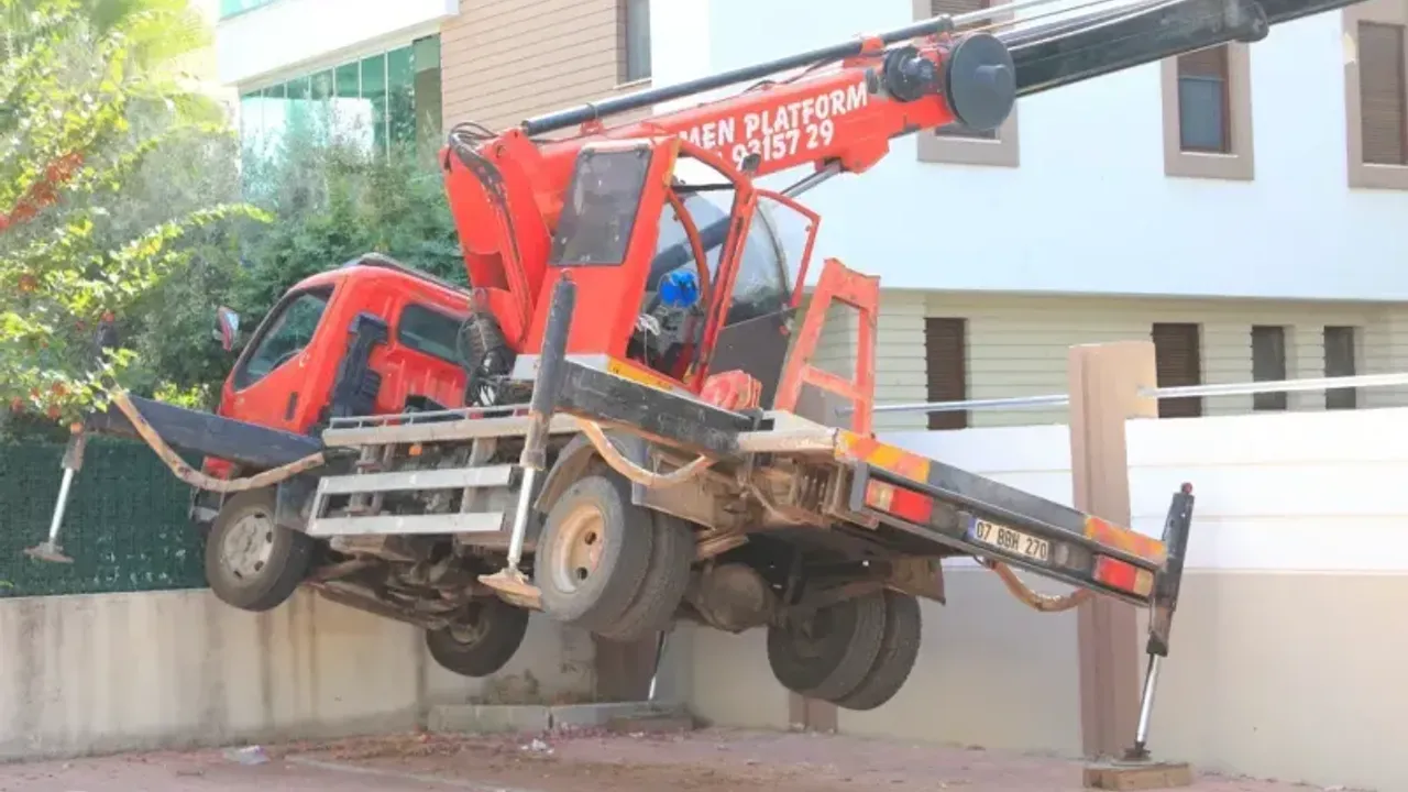 Antalya'da ağaç budaması için kiralanan ve hidroliği boşalan vinç yan yattı. Vincin devrilmesini sitenin duvarı engellerken, olay anında sepette ağaçları budamakta olan görevliyi, bulunduğu yerden itfaiye ekipleri kurtardı.