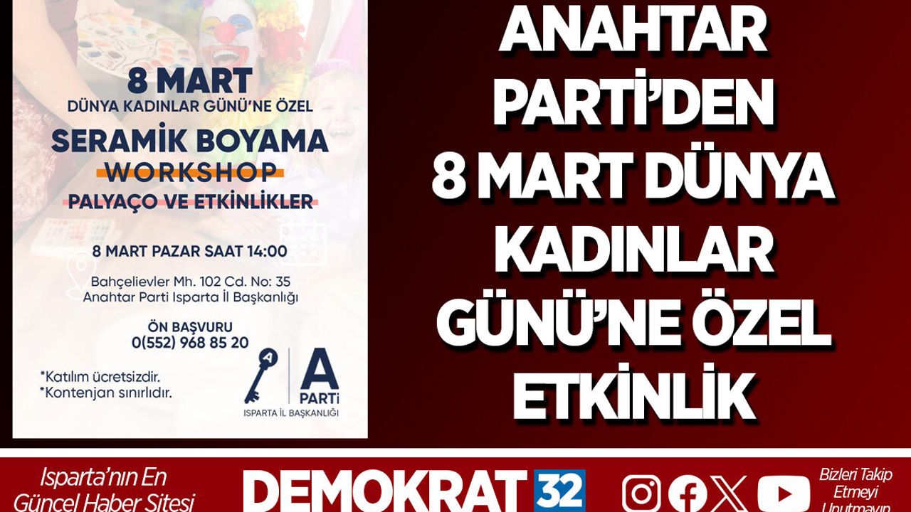 Anahtar Parti Isparta İl Başkanlığı, 8 Mart Dünya Kadınlar Günü dolayısıyla kadınlara yönelik özel bir etkinlik düzenliyor. Anahtar Parti İl Başkanı Elif Uzel Kurucu, kadınların ve çocukların bir araya gelerek keyifli vakit geçirebileceği etkinliğe tüm kadınları davet etti.