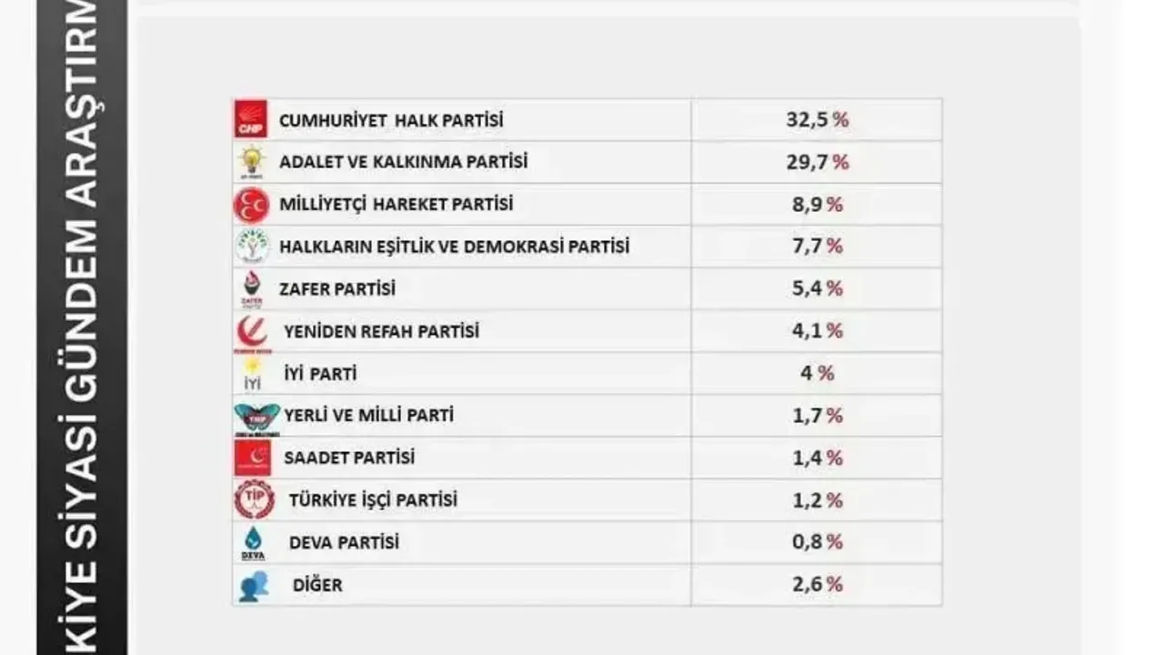 Katılımcıların yüzde 32,5'i bu soruya 'CHP' yanıtını vererek CHP'yi ilk sıraya taşıdı. AKP ise yüzde 29,7 ile kendisine ikinci sırada yer buldu. CHP ve AKP'yi; yüzde 8,9 ile MHP, yüzde 7,7 ile DEM Parti izledi. İYİ Parti ise baraj altı kaldı.