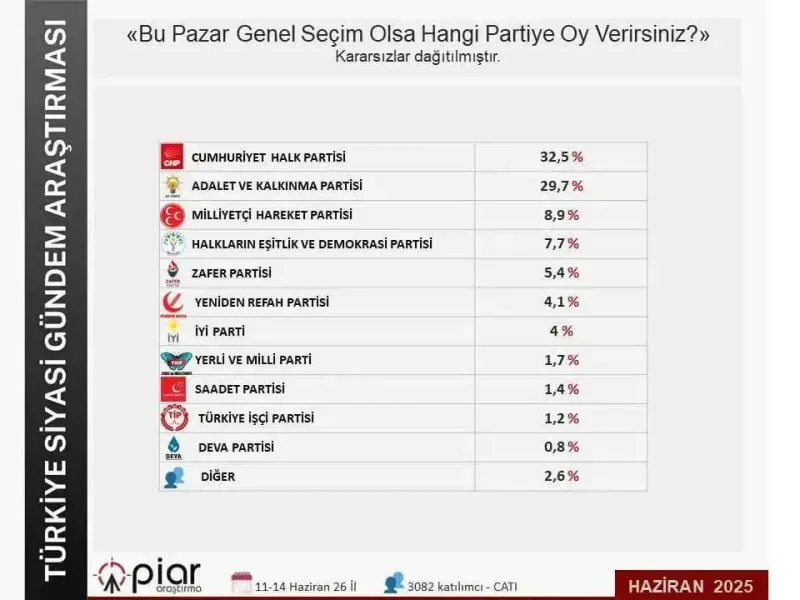 PİAR Araştırma, son anket çalışmasının sonuçlarını yayımladı. 11-14 Haziran tarihlerinde 26 ilde 3 bin 82 katılımcı ile gerçekleştirilen ankette katılımcılara, "Bu Pazar Genel Seçim olsa hangi partiye oy verirsiniz?" sorusu yöneltildi.