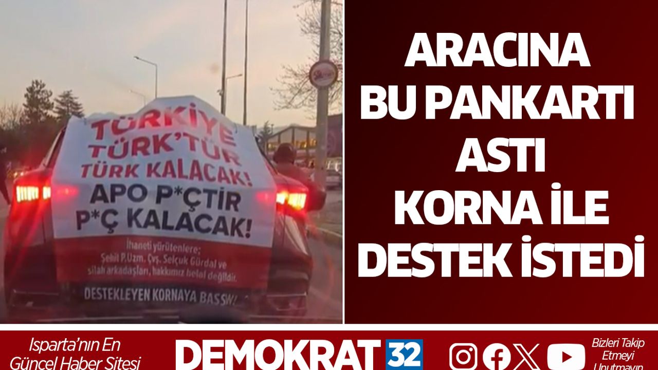 Üzerinde “Türkiye Türktür, Türk kalacak” ve terör örgütü PKK elebaşı Abdullah Öcalan’a yönelik ifadelerin yer aldığı pankartla seyir halinde olan sürücü Celalettin Gürdal, trafikteki diğer araçlara da çağrıda bulundu.