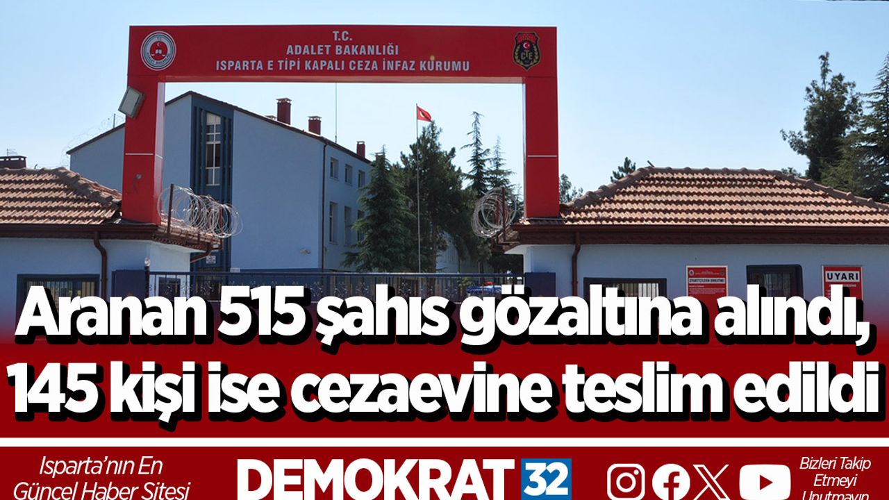Isparta’da polis ekipleri, geçtiğimiz ay yaptıkları denetim ve operasyonlarda, çeşitli suçlardan aranan toplam 515 şahsı yakaladı. Bu kişilerden 145 kişi cezaevine teslim edildi.