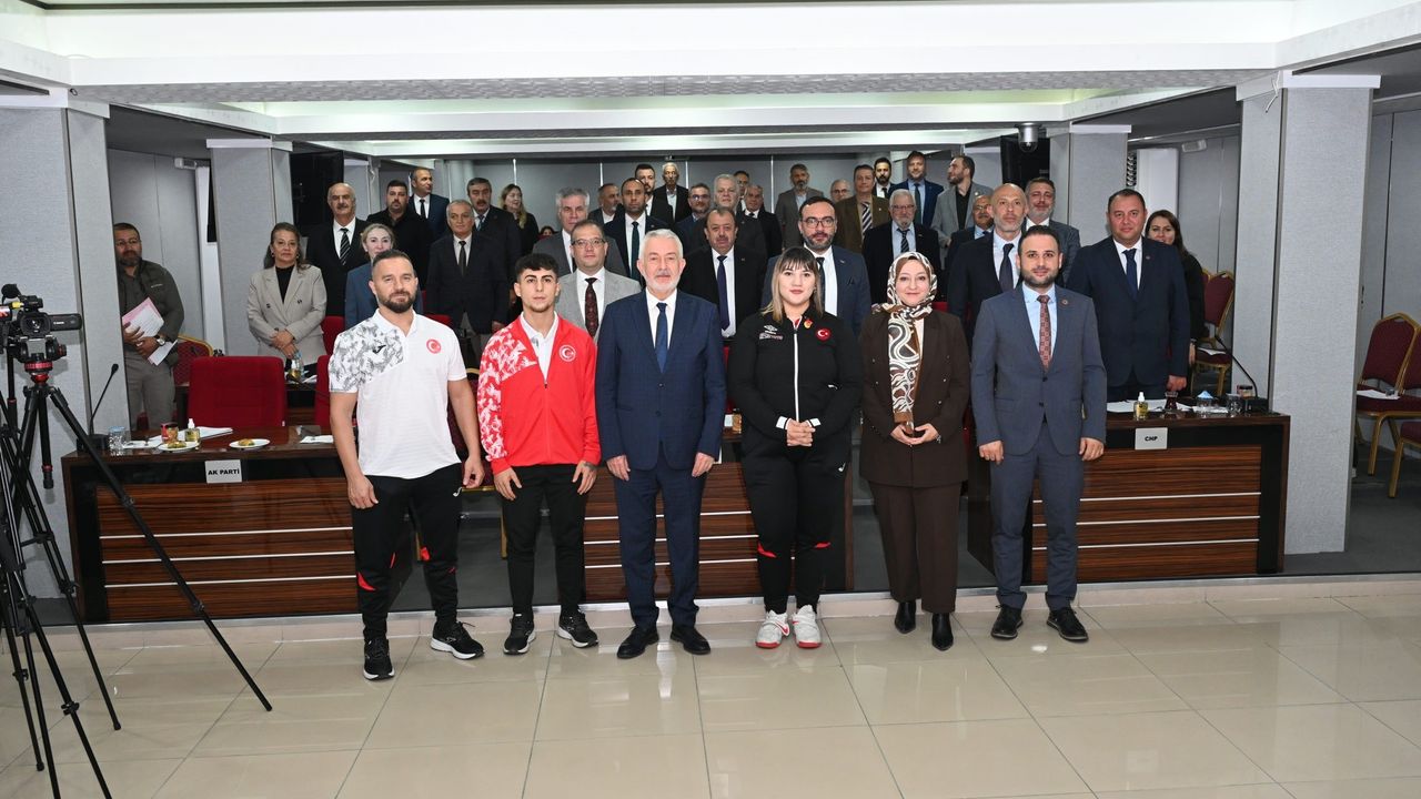 Milli sporcular Fatmagül Çevik ve Mustafa Erdoğan ile antrenör Ferit Şen, Isparta Belediye Meclisi'nin kasım ayı toplantısına misafir oldu. Belediye Başkanı Şükrü Başdeğirmen, toplantı öncesinde milli sporcular Fatmagül Çevik ve Mustafa Erdoğan ile antrenör Ferit Şen'i altınla ödüllendirdi.