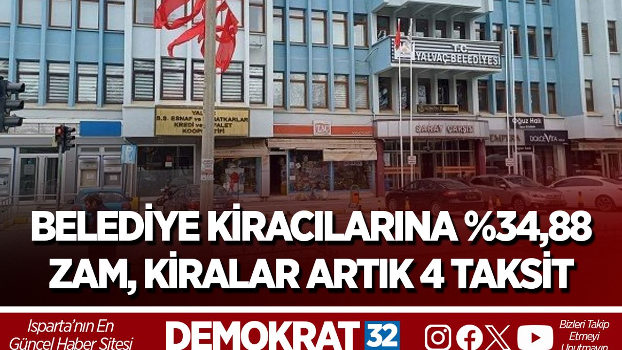 Yalvaç Belediyesi’ne ait işyerlerinde kiracı olarak oturanların kira bedellerine 2026 yılı için %34,88 oranında zam yapıldığı duyuruldu.