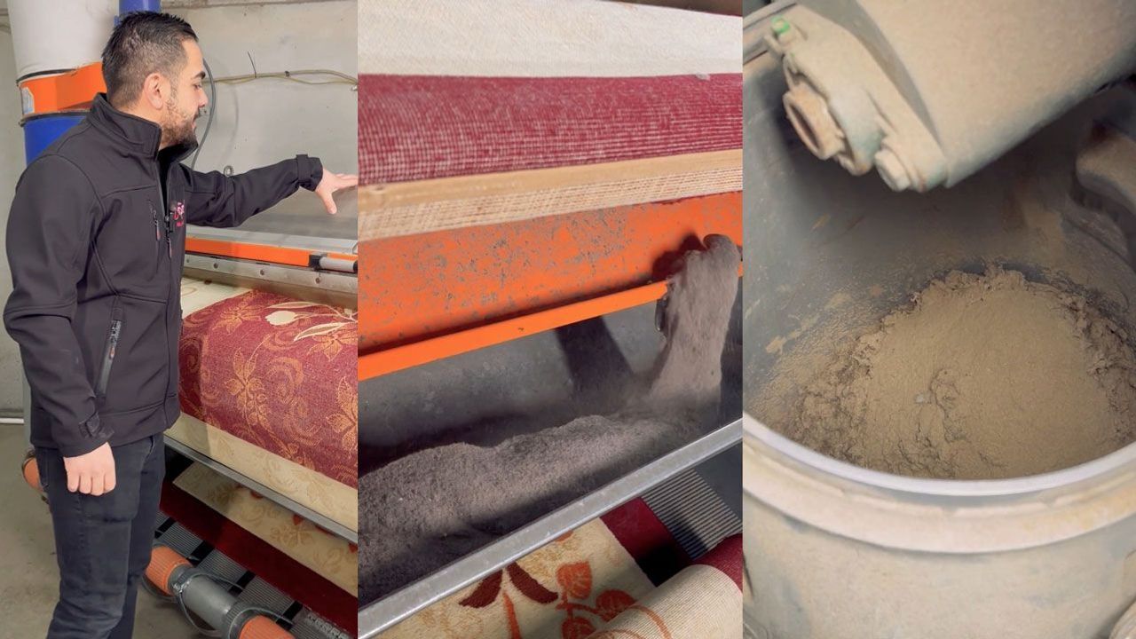 Firma sahibi Kazım Kabaoğlu, kendi sunumuyla çekilen videoda halının çırpma makinesine yerleştirilmesinden itibaren çıkan toz, bakteri ve kirleri anbean gösterdi. Görüntülerde, dışarıdan temiz görünen bir halının iç kısmında biriken yoğun kir tabakası net şekilde ortaya çıkıyor.