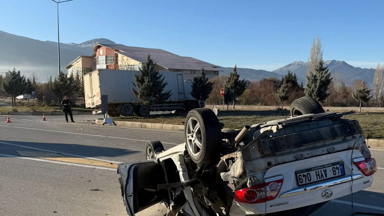 Kaza, Altınyayla ilçesi Dirmil Kavşağı'nda meydana geldi. Edinilen bilgiye göre, sürücüleri öğrenilemeyen 32 ABA 083 plakalı kamyon ile 48 AYH 049 plakalı otomobil kavşakta çarpıştı. Çarpmanın etkisiyle otomobil takla atarken, kamyon refüje çıktı. Kazada otomobil sürücüsü yaralanırken, ihbar üzerine olay yerine sağlık ve polis ekipleri sevk edildi. Yaralı sürücü sağlık ekipleri tarafından yapılan ilk müdahalenin ardından ambulansla hastaneye kaldırıldı.