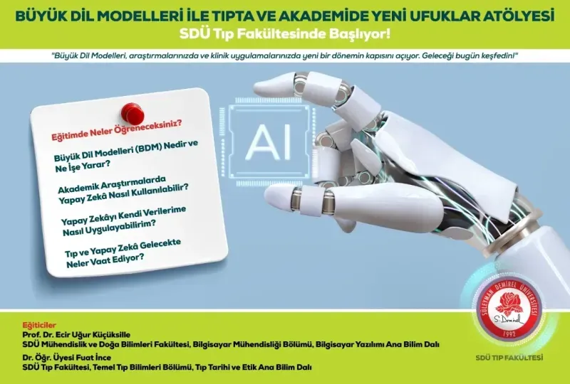 Süleyman Demirel Üniversitesi Tıp Fakültesi tarafından, öğretim üyeleri ve araştırma görevlilerine yönelik “Büyük Dil Modelleri ile Tıpta ve Akademide Yeni Ufuklar” atölyesi (workshop) başlıyor. Tıp Fakültesinden 40 araştırma görevlisi ve öğretim üyesinin katılacağı atölye, 17 Nisan 2025 Perşembe günü saat 14.00’te başlayacak.