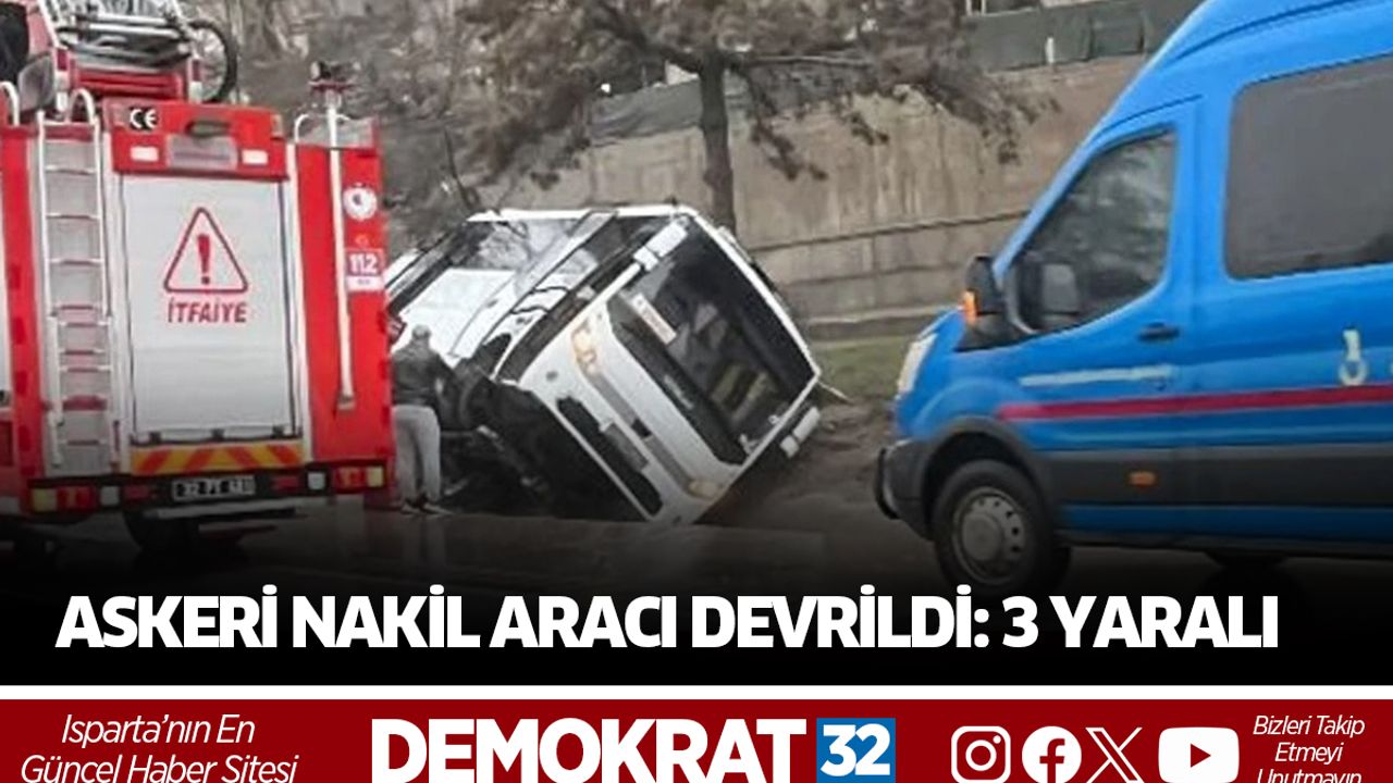 Isparta’da askeri nakil aracının devrilmesi sonucu 3 kişi yaralandı. Kaza, 12 Şubat 2026 Perşembe günü saat 11.40 sıralarında Göltaş Çimento Fabrikası önü, Burdur-Isparta Karayolu Merkez/ISPARTA mevkiinde meydana geldi.