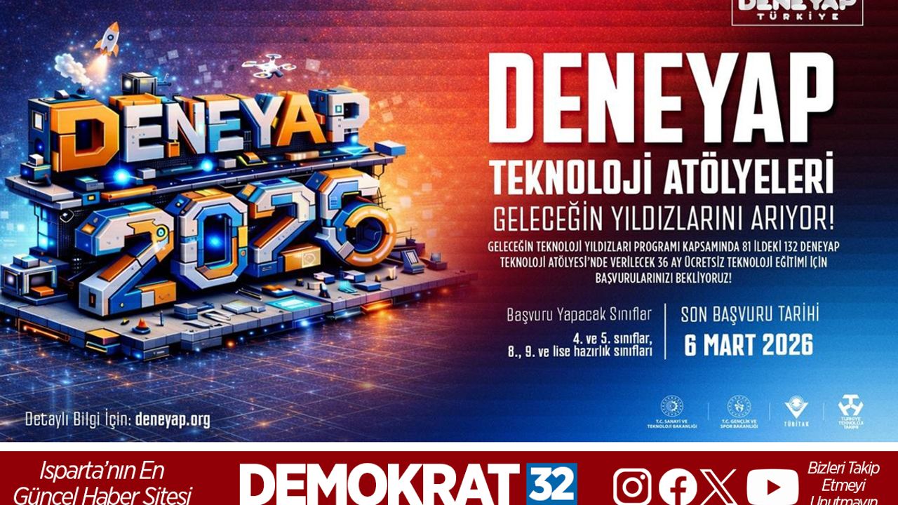 Isparta İl Sanayi ve Teknoloji Müdürlüğü’nden, yapılan açıklamada: “Türkiye’nin Milli Teknoloji Hamlesi vizyonuyla şekillenen ve T.C. Sanayi ve Teknoloji Bakanlığı, T.C. Gençlik ve Spor Bakanlığı, TÜBİTAK ve Türkiye Teknoloji Takımı Vakfı (T3 Vakfı) paydaşlığında yürütülen “DENEYAP Teknoloji Atölyeleri” kapsamında, teknolojiye tutkuyla bağlı, hayallerini üretime dönüştürmek isteyen gençler için 2026 Öğrenci Seçme Süreci başvuruları başladı” denildi.