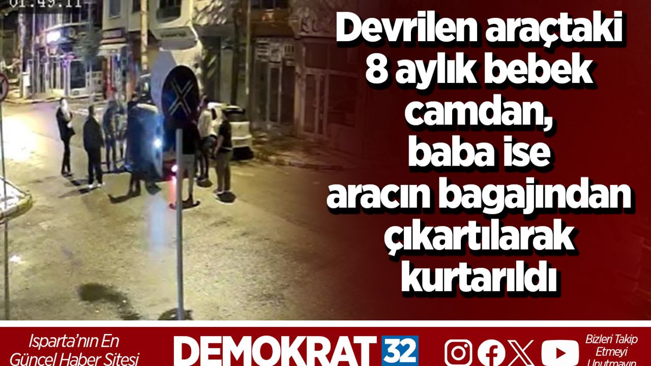 Devrilen araçtaki 8 aylık bebek camdan, baba ise aracın bagajından çıkartılarak kurtarıldı