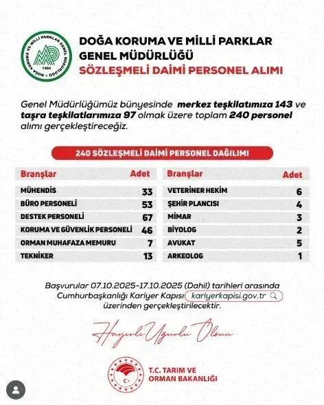 Doğa Koruma ve Milli Parklar Genel Müdürlüğü, merkez ve taşra teşkilatlarında görevlendirilmek üzere toplam 240 sözleşmeli daimi personel alımı gerçekleştirecek.