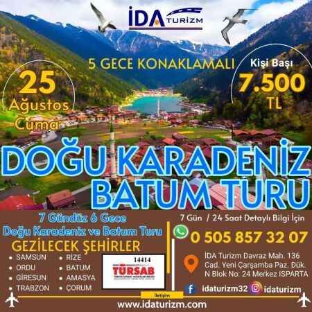 Sabah otelde aldığımız kahvaltımızın ardından fındık alışverişimizi yapabilmek için fındık diyarına gidiyoruz. Dönüş yolumuza geçerken Orta Karadeniz Bölümü’nde yer alan Anadolu’nun eski yerleşim alanlarından Amasya iline gidiyoruz ve Amasya’da öğle yemeği için siz değerli misafirlerimize serbest zaman veriyoruz. Serbest zamanımızdan sonra yine yol güzergâhımızda olan Çorum’a uğrayarak Çorum’un en meşhur yiyecekleri arasında kabul edilen leblebisini almak için molamızı veriyoruz. Serbest zaman eşliğinde alıveriş imkânını değerlendirip Çorum ilini de hatıralarımıza ekliyoruz. Çorum gezimizden sonra Doğu Karadeniz ve Batum Turumuzu tamamlayarak dönüş yolculuğumuza geçiyoruz. Yaklaşık 12-13 saat kadar yolculuğumuzun ardından Isparta’ya geliyoruz. Bir başka İDA Tur programında görüşmek dileğiyle…
