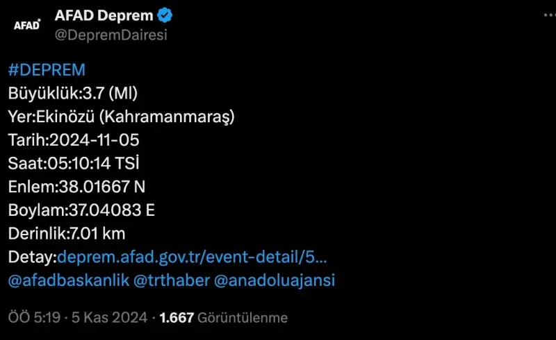 AFAD'ın resmi hesabından yapılan açıklamaya göre, Kahramanmaraş'ın Ekinözü ilçesinde saat 05.10 sıralarında 3.7 büyüklüğünde bir deprem meydana geldi.
