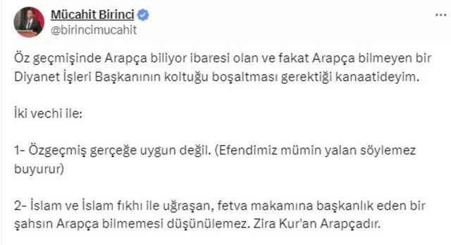 Erbaş'ı istifaya davet eden Birinci paylaşımına, "Özgeçmişinde Arapça biliyor ibaresi olan ve fakat Arapça bilmeyen bir Diyanet İşleri Başkanının koltuğu boşaltması gerektiği kanaatindeyim." notunu düştü.