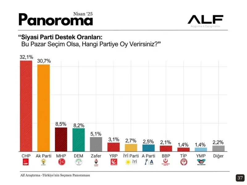 2-7 Nisan ayında yapılan anket sonucuna göre “Bu pazar seçim olsa, hangi partiye oy verirsiniz?" sorusa CHP diyenlerin oranı yüzde 32,1 oldu. AKP diyen vatandaşları oranı ise yüzde 30,7 oldu.