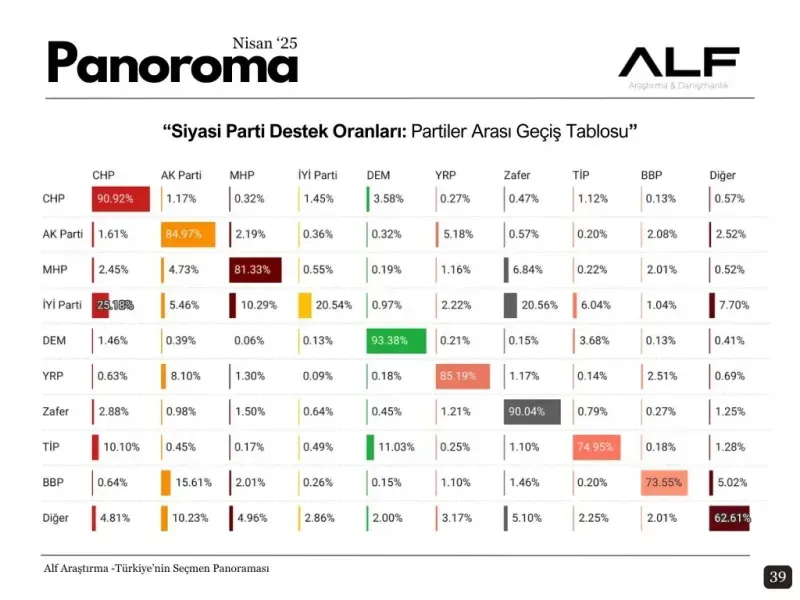 ALP'nin araştırmasında en dikkat çeken ise partiler arası geçiş tablosuna oldu. Sonuçlara göre CHP seçmeninin yüzde 90,92'si partisinde kalmaya etti. DEM Parti'ye geçenlerin oranı yüzde 3,58 oldu.