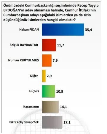 Vatandaşlara, Cumhurbaşkanı Erdoğan'ın listede olmadığı ankette 3 isim seçenek olarak sunuldu. Bunlardan biri Dışişleri Bakanı Hakan Fidan, ikincisi Erdoğan'ın damadı Selçuk Bayraktar, diğeri ise TBMM Başkanı Numan Kurtulmuş'tu.