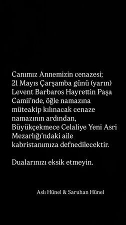 Aslı Hünel, daha sonra annesinin cenazesine dair detayları paylaştı; "Canımız annemizin cenazesi; 21 Mayıs Çarşamba günü (yarın) Levent Barbaros Hayrettin Paşa Camii'nde, öğle namazına müteakip kılınacak cenaze namazının ardından, Büyükçekmece Celaliye Yeni Asri Mezarlığı'ndaki aile kabristanımıza defnedilecektir. Dualarınızı eksik etmeyin" ifadelerini kullandı.
