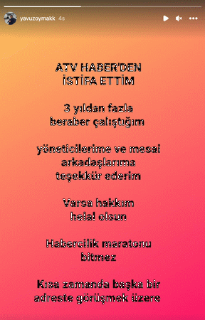 ATV Haber’den veda haberi geldi. Yaklaşık 3 yıldır kanalda görev alan deneyimli muhabir, ‘istifa ettim’ diyerek ayrılığını duyurdu.