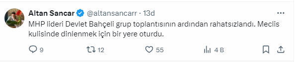 Bahçeli'nin grup toplantısının ardından rahatsızlandığını aktaran gazeteci Altan Sancar, Bahçeli'nin dinlenmek için bir yere oturduğunu aktardı.
