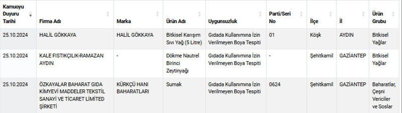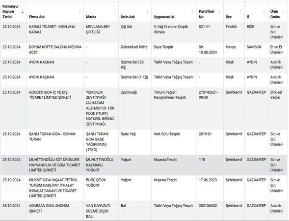 Yeni listede ise sütte hile, köftede soya, balda sahtecilik, zeytinyağında tohum yağı, yoğurtta nişasta, sıvı yağ ve sumakta boya tespit edildi.