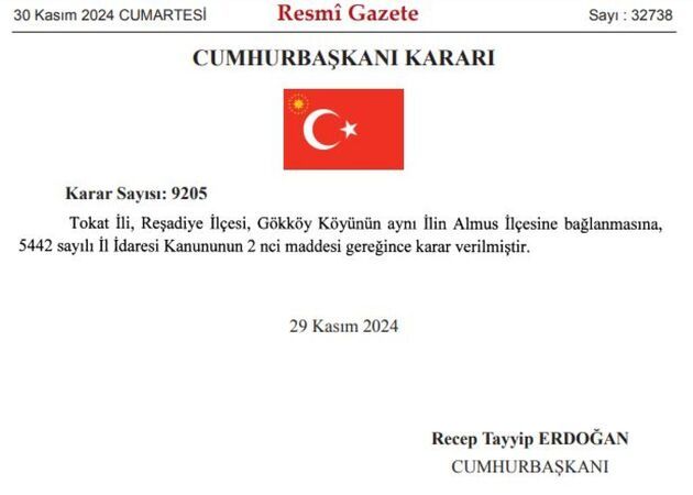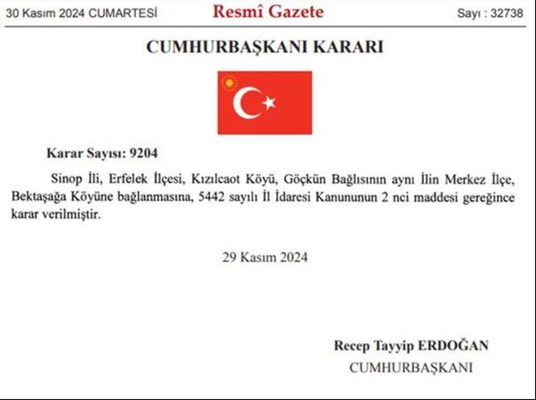 Cumhurbaşkanı Recep Tayyip Erdoğan'ın imzasıyla yayımlanan kararlara göre, Tokat'ın Reşadiye ilçesinin Gökköy köyü Almus ilçesine, Sinop'un Erfelek ilçesinin Kızılcaot köyü Göçkün bağlısı Merkez Bektaşağa köyüne bağlandı.