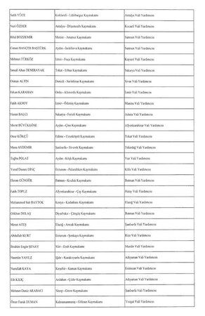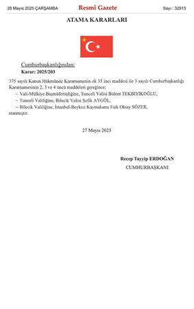 Bugün yayımlanan Resmi Gazete'de birçok atama kararı yer aldı. Cumhurbaşkanı Recep Tayyip Erdoğan'ın imzasını taşıyan kararlara göre Vali-Mülkiye Başmüfettişliğine Tunceli Valisi Bülent Tekbıyıkoğlu; Tunceli Valiliğine, Bilecik Valisi Şefik Aygöl; Bilecik Valiliğine İstanbul-Beykoz Kaymakamı Faik Oktay Sözer atandı. Öte yandan çok sayıda kaymakamın da görev yeri değişti.