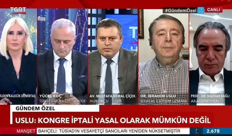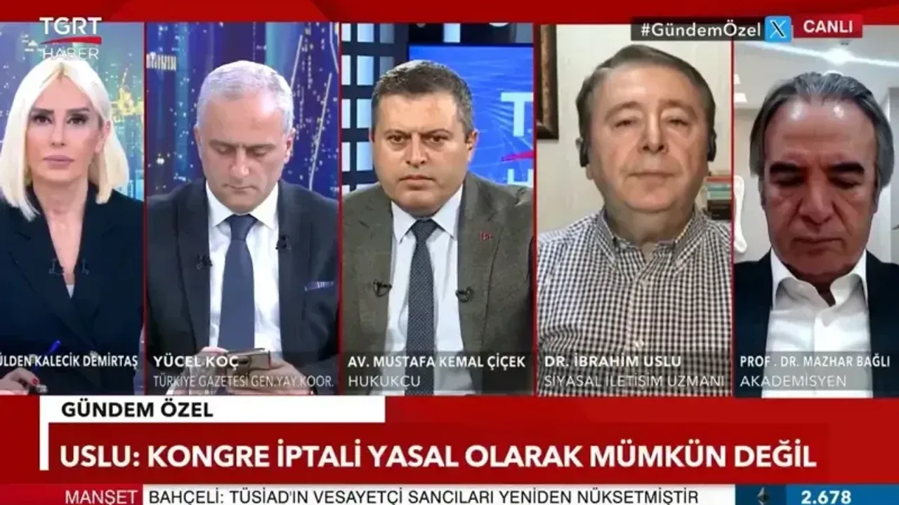 CHP kurultayında rüşvet dağıtıldığına dair iddialar, TGRT Haber’in Gündem Özel programında masaya yatırıldı. Programda konuyla ilgili değerlendirmelerde bulunan Siyasal İletişim Uzmanı İbrahim Uslu, CHP yönetiminin iptal edilmesiyle CHP Genel Başkanı Özgür Özel'in yerine kayyum atanmasının mümkün olmadığını dile getirdi.