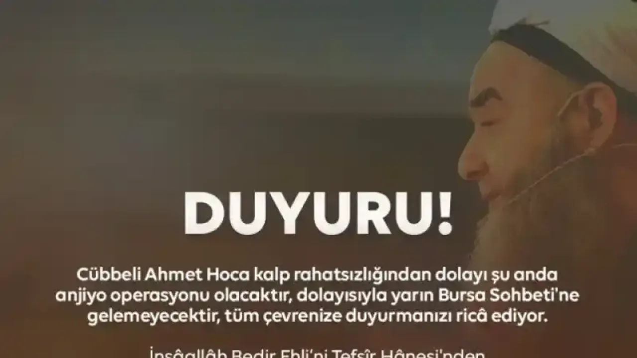 "Cübbeli Ahmet Hoca kalp rahatsızlığından dolayı şu anda anjiyo operasyonu olacaktır, dolayısıyla yarın Bursa Sohbeti'ne gelemeyecektir, tüm çevrenize duyurmanızı ricâ ediyor"