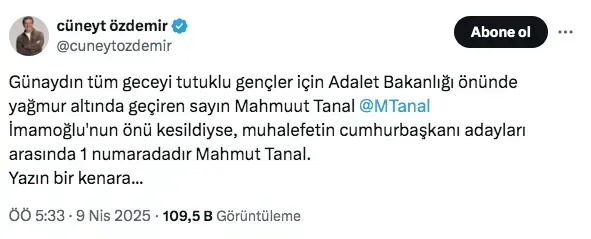-Günaydın tüm geceyi tutuklu gençler için Adalet Bakanlığı önünde yağmur altında geçiren sayın Mahmuut Tanal... İmamoğlu'nun önü kesildiyse, muhalefetin cumhurbaşkanı adayları arasında 1 numaradadır Mahmut Tanal. Yazın bir kenara...