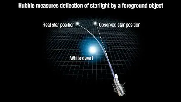 ABD'nin Maryland eyaletindeki Uzay Teleskobu Bilimi Enstitüsünden gökbilimci Kailash Sahu liderliğindeki araştırma ekibi, Hubble'ın görüntülerini kullanarak, Dünya'dan 5 bin ışık yılı uzaktaki bir yıldızın ışığının, Dünya'ya 17 ışık yılı mesafedeki beyaz cüce yıldız Stein 2051 B'nin hizasına geldiğinde bükülerek konum değiştirdiğini gözledi.