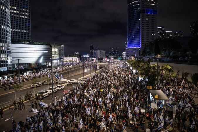 Protestoların merkezi, binlerce İsraillinin akşam saatlerinde toplandığı başkent Tel Aviv'de, Netanyahu hükümetinin yargı düzenlemelerine karşı yapılan gösterilerde sembolleşen, polisin demir bariyerlerle kapattığı Kaplan Caddesi oldu.