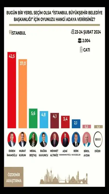 Özdemir Araştırma'nın 23-24 Şubat tarihleri arasında 2004 kişi ile gerçekleştirdiği anketin sonuçları ise kafa karıştırdı. Özdemir'in anketine göre, oyunu Ekrem İmamoğlu'na vereceğini söyleyenlerin oranı yüzde 42.5, oyunu Murat Kurum'a verenlerin oranı ise yüzde 37 çıktı. DEM adayı Meral Danış Beştaş yüzde 5.6, İYİ Parti adayı Buğra Kavuncu 4.8, Yeniden Refah adayı Mehmet Altınöz yüzde 4.1, Zafer Partisi adayı Azmi Karamahmutoğlu ise yüzde 3.4 çıktı.