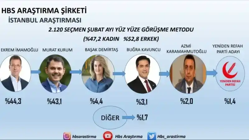HBS Araştırma Şirketi'nin İstanbul Büyükşehir Belediye Başkanlığı için gerçekleştirdiği yeni ankete göre, İstanbul'da seçim yarışı kızışıyor. Şubat ayında 2 bin 120 seçmenle yüz yüze görüşme metoduyla yapılan ankette, İstanbul Büyükşehir Belediye Başkanı Ekrem İmamoğlu'nun liderliğini koruduğu ortaya çıktı. İmamoğlu, 44.3 puanla öne geçerken, AKP'nin adayı Murat Kurum ise 43.1 puanla ikinci sırada yer aldı.