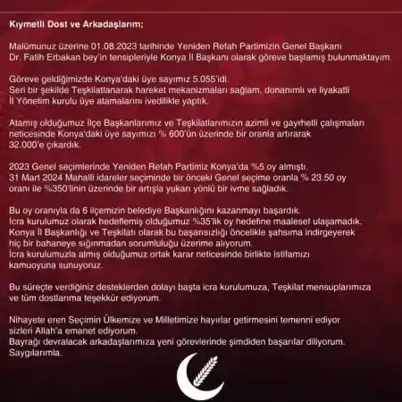 Duyuruda ''Malimunuz üzerine 01.08.2023 tarihinde Yeniden Refah Partimizin Genel Başkanı Dr. Fatih Erbakan Bey'in tensipleriyle Konya İl Başkanı olarak göreve başlamış bulunmaktayım. Göreve geldiğimizde Konya'daki üye sayımız 5055'idi. Seri bir şekilde teşkilatlanarak hareket mekanizmaları sağlam, donanımlı ve liyakatli II Yönetim kurulu üye atamalarını ivedilikle yaptık. Atamış olduğumuz ilçe başkanlarımız ve teşkilatlarımızın azimli ve gayretli çalışmaları neticesinde Konya'daki üye sayımızı yüzde 600'ün üzerinde bir oranla artırarak 32 bine çıkardık. 2023 Genel Seçimlerinde Yeniden Refah Partimiz Konya'da yüzde 5 oy almıştı. 31 Mart 2024 Mahalli idareler seçiminde bir önceki genel seçime oranla yüzde 23,50 oy oranı ile yüzde 350'linin üzerinde bir artışla yukarı yönlü bir ivme sağladık. Bu oy oranıyla da 6 ilçemizin belediye başkanlığını kazanmayı başardık. İcra kurulumuz olarak hedeflemiş olduğumuz yüzde 35'lik oy hedefine maalesef ulaşamadık. Konya İl Başkanlığı ve teşkilatı olarak bu başarısızlığı öncelikle şahsıma indirgeyerek hiçbir bahaneye sığınmadan sorumluluğu üzerime alıyorum. İcra kurulumuzla almış olduğumuz ortak karar neticesinde birlikte istifamızı kamuoyuna sunuyoruz'' denildi.