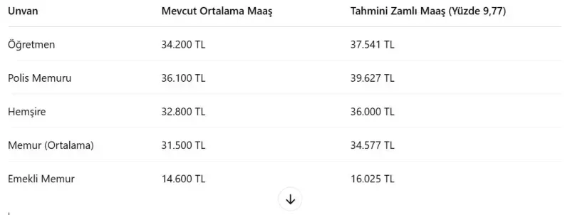 Şu anda bazı unvanlara göre ortalama maaşlar ve yüzde 9,77 zam oranı uygulanırsa tahmini maaşlar şöyle şekillenebilir: