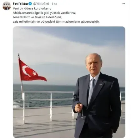 Yıldız, paylaştığı fotoğrafın altına yazdığı ifadelerde Bahçeli’nin liderliğine ve yüksek vasıflarına vurgu yaparak, “Yeni bir dünya kurulurken; ahlak, cesaret, bilgelik gibi yüksek vasıflarınız, tenezzülsüz ve tavizsiz liderliğiniz, aziz milletimizin ve bölgedeki tüm mazlumların güvencesidir” dedi.
