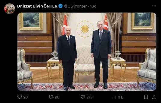 MHP Genel Başkan Yardımcısı İzzet Ulvi Yönter, Devlet Bahçeli ve Cumhurbaşkanı Erdoğan'ın Saray'daki bir görüşmesinden fotoğraf paylaştı.