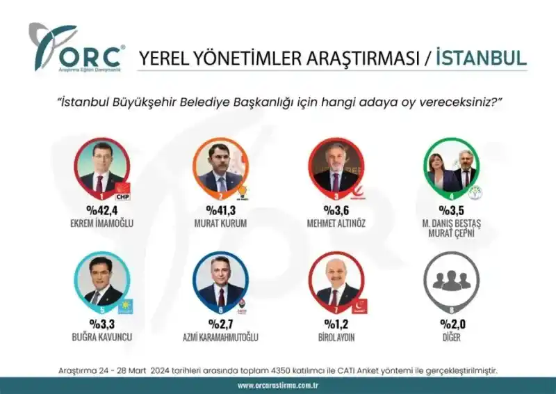 ORC Araştırma şirketi, İstanbul'da 24 - 28 Mart'ta, 4 bin 350 kişiyle görüşerek gerçekleştirdiği yerel seçim anketinin sonucunu açıkladı.