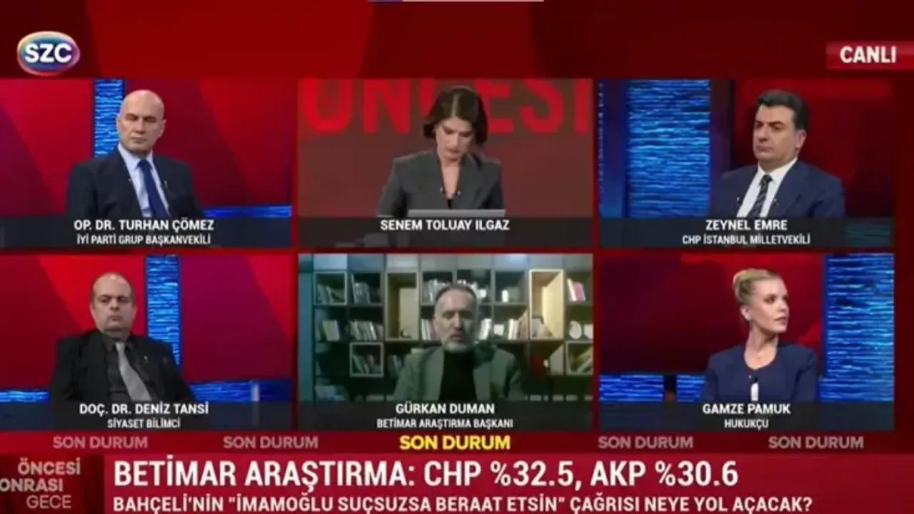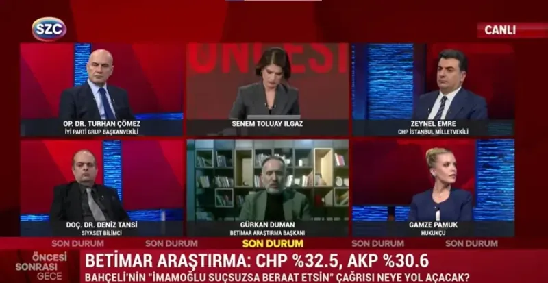 SÖZCÜ TV'de Senem Toluay Ilgaz'ın sunduğu Öncesi Sonrası Gece programına katılan BETİMAR Araştırma Başkanı Gürkan Duman, son anketlerinin verilerini canlı yayında açıkladı.