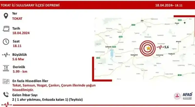 AFAD'dan alınan bilgiye göre, saat 18.11'de merkez üssü Tokat'ın Sulusaray ilçesinde 5.6 büyüklüğünde deprem kaydedildi. Deprem yerin 5,9 kilometre derinliğinde meydana geldi. Sarsıntı, çevre illerde de hissedildi.