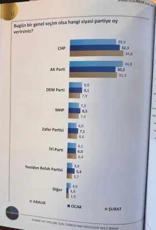 CHP; Aralık, Ocak ve Şubat aylarında oylarını artıran tek parti oldu. Aralık ayında yüzde 29.9 olan CHP Şubat ayında 34,8 oldu.