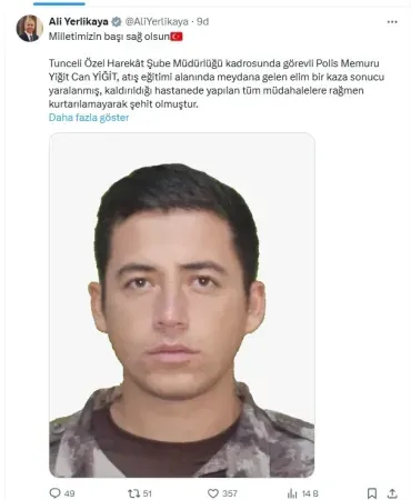 Tunceli Özel Harekat Şube Müdürlüğü'nde görev yapan Polis Memuru Yiğit Can Yiğit, atış eğitimi alanında meydana gelen kaza sonucu yaralandı. Hastaneye kaldırılan Yiğit, yapılan tüm müdahalelere rağmen kurtarılamayarak şehit oldu.