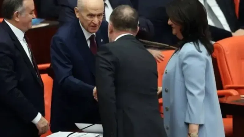 Milliyetçi Hareket Partisi (MHP) Genel Başkanı Devlet Bahçeli, geçtiğimiz haftalarda Türkiye Büyük Millet Meclisi'nin açılış oturumu sonrasında, DEM Parti Eş Genel Başkanı Tuncer Bakırhan, DEM Parti Grup Başkan Vekili Sezai Temelli, DEM Parti Van Milletvekili Pervin Buldan ve DEM Parti Ağrı Milletvekili Sırrı Sakık ile tokalaşmıştı.