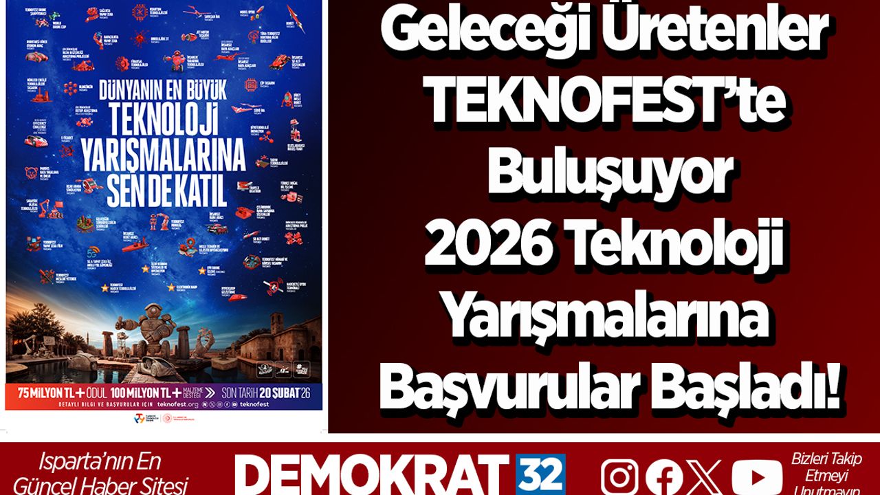 Isparta İl Sanayi ve Teknoloji Müdürlüğü’nden konuyla ilgili yapılan açıklamada: “Bu yıl yeni adresi Şanlıurfa olan TEKNOFEST, 75 milyon TL ödül ve 100 milyon TL’den fazla maddi desteğiyle genç zihinleri yeni keşiflere davet ediyor. Fikirleri projeye, projeleri geleceğe dönüştürmek isteyenler için yarışma başvuruları ise 20 Şubat’a kadar devam ediyor! Dünyanın en büyük havacılık, uzay ve teknoloji festivali TEKNOFEST, 2026 yılında binlerce yıllık tarihi ve köklü medeniyet mirasıyla öne çıkan Şanlıurfa’da düzenlenecek. 30 Eylül - 4 Ekim tarihleri arasında GAP Havalimanı’nda gerçekleşecek TEKNOFEST 2026, bilimi ve teknolojiyi tarihin sıfır noktası Şanlıurfa’da milyonlarla buluşturacak. Her yıl yenilenen yarışma kategorileriyle dikkat çeken TEKNOFEST, dünyanın en büyük ödüllü teknoloji yarışmalarına bu yıl da ev sahipliği yapıyor. 2026 yılında 52 yarışma ve 127 alt kategoride düzenlenecek TEKNOFEST Teknoloji Yarışmaları için başvurular, 20 Şubat’a kadar devam ediyor.