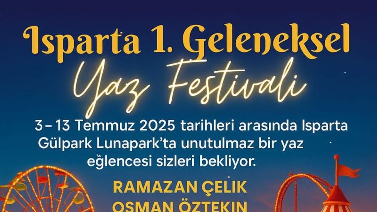 Isparta 1. Geleneksel Yaz Festivali kapsamında 3-13 Temmuz 2025 tarihleri arasında Isparta Gülpark Lunapark'ta unutulmaz bir yaz eğlencesi sizi bekliyor.